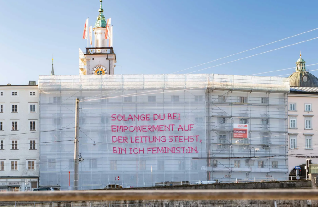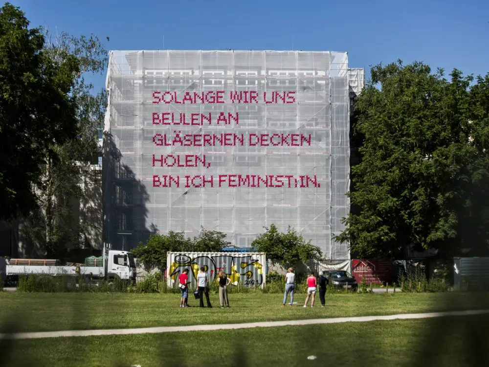 Ein Satz, der mit „Solange“ beginnt und mit „bin ich Feminist:in“ endet, wird mit pinkem Tüll im Kreuzstich großformatig auf Staubschutznetze gestickt und an Baugerüste montiert. Das Spannungsfeld entsteht aus der Dynamik zwischen traditionell weiblich konnotiertem Handwerk und Männer-dominierter Baustelle. Die großformatigen Botschaften verdeutlichen die anhaltende Notwendigkeit feministischer Forderungen